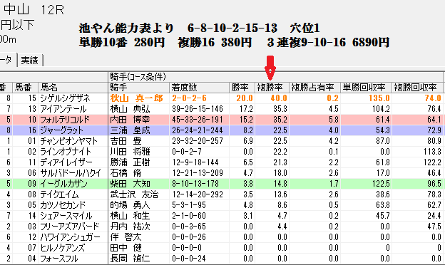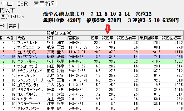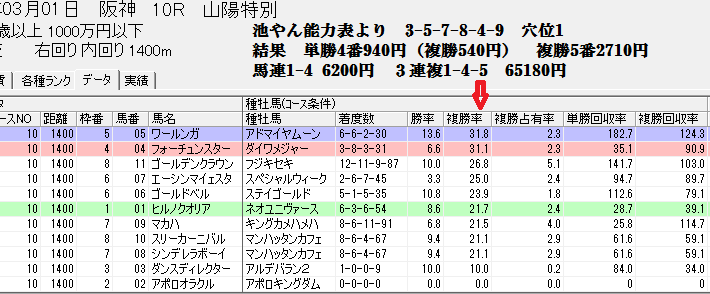 複勝率2位 能力表5位の4番フォーチュンスター 単勝940円 複勝540円