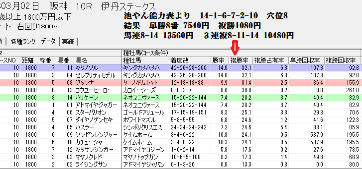 複勝率3位 能力表穴位の8番ジャンナ 単勝7540円 複勝1080円