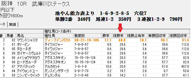 複勝率1位 能力表4位の2番マウントシャスタ 単勝340円 複勝130円