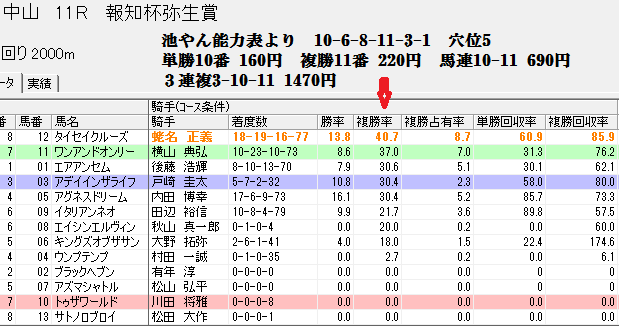 複勝率2位 能力表4位の11番ワンアンドオンリー 複勝220円
